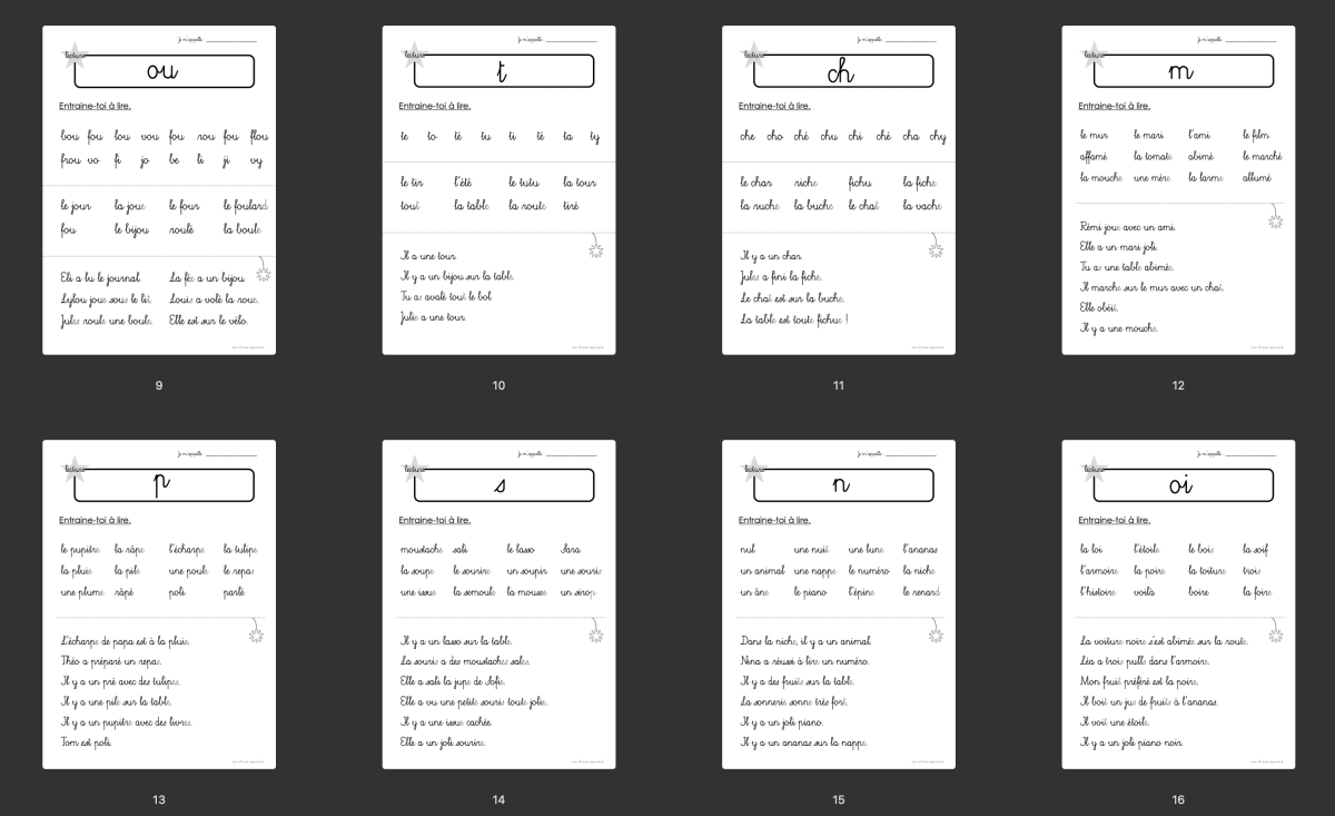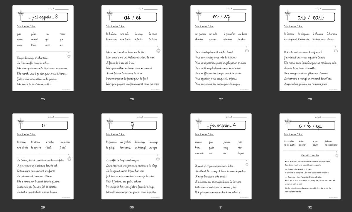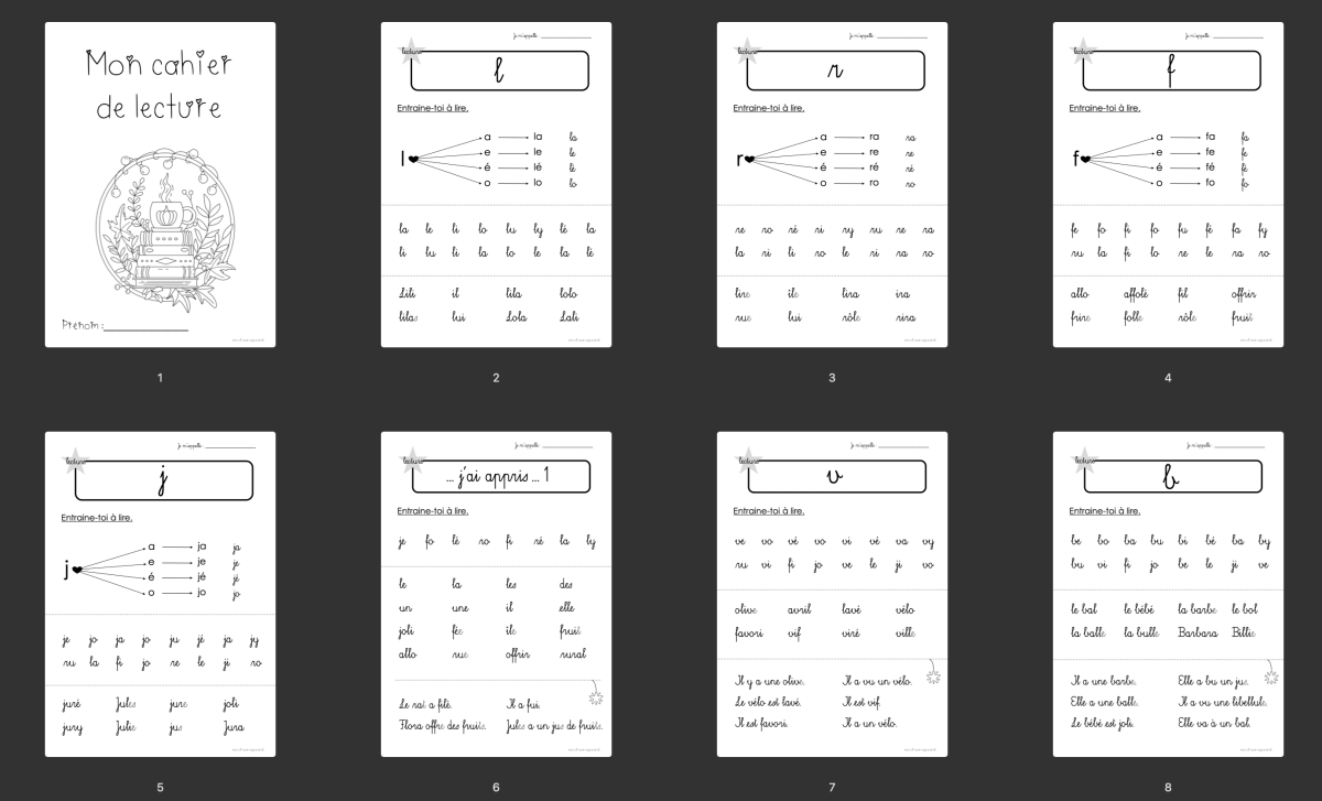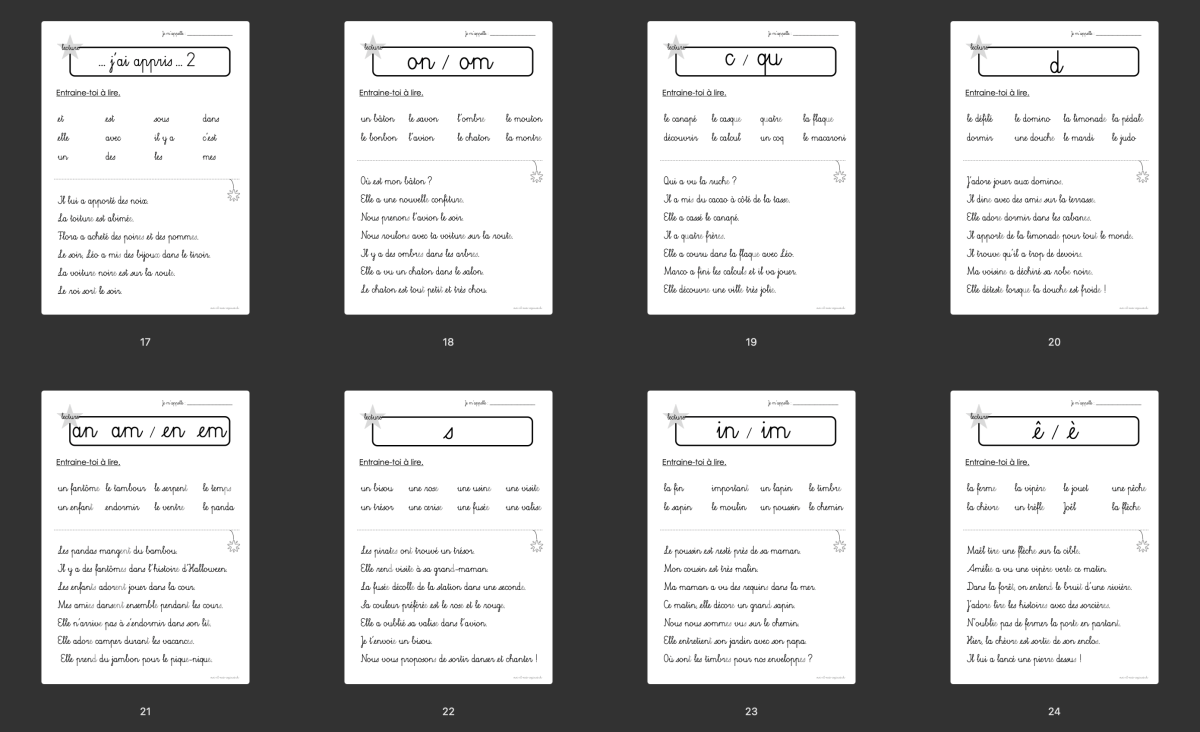 💞 Les fiches travaillent les syllabes, les mots, les phrases puis des textes.