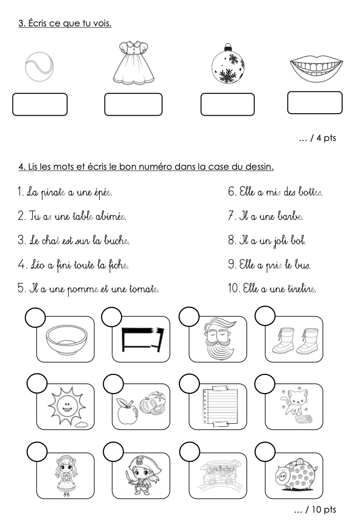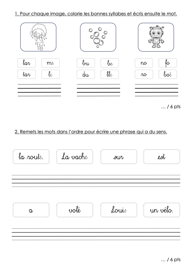 Evaluation de français sur tous les phonèmes et graphèmes appris jusqu'à la lettre M.