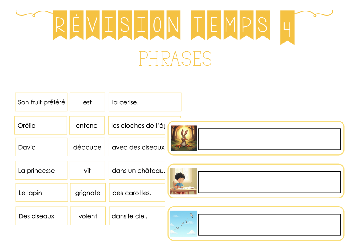 ❤ En observant l'illustration, l'élève recompose des phrases à l'aide des étiquettes.