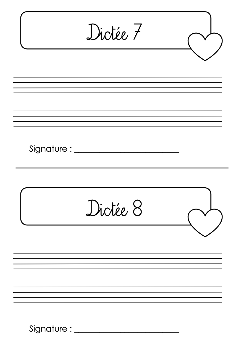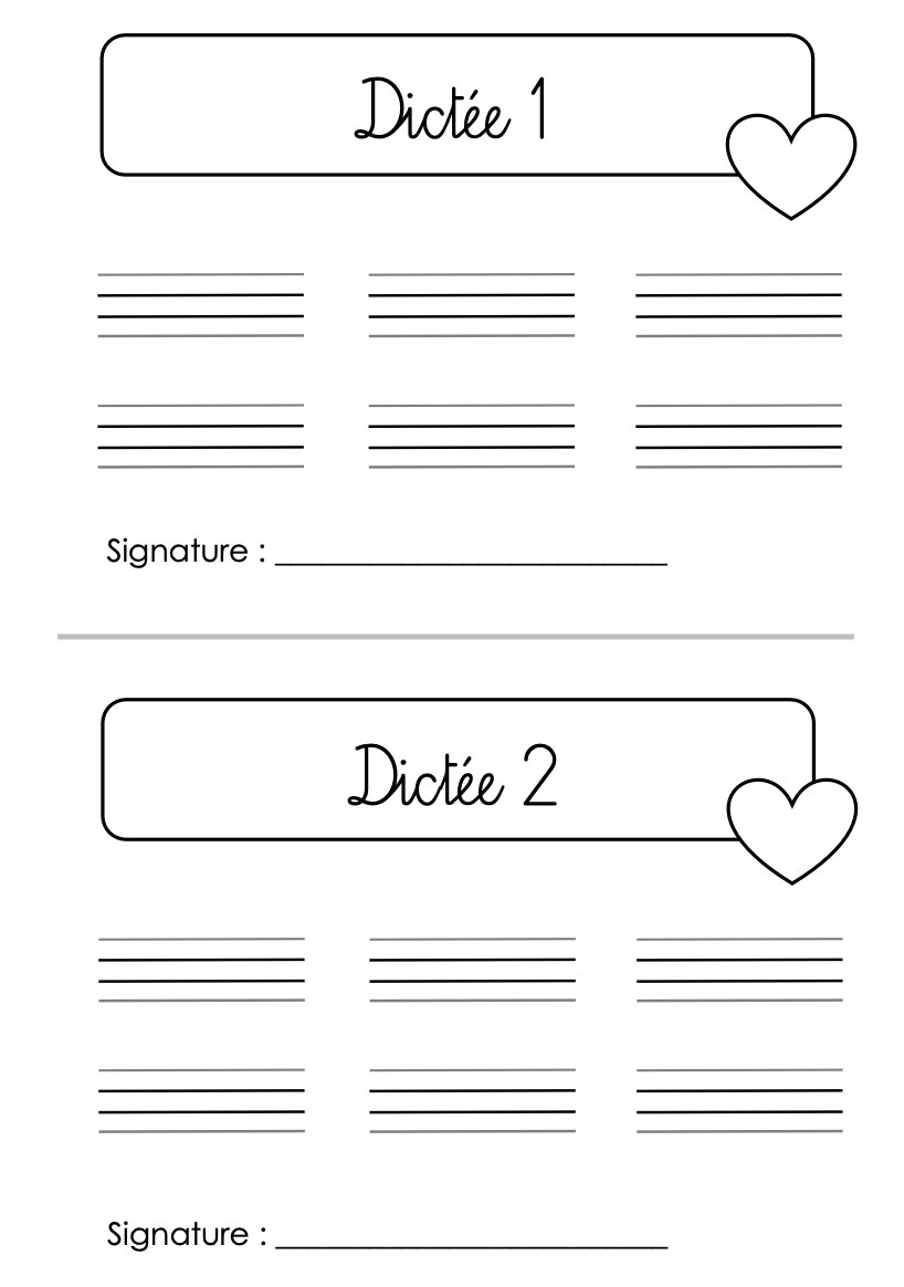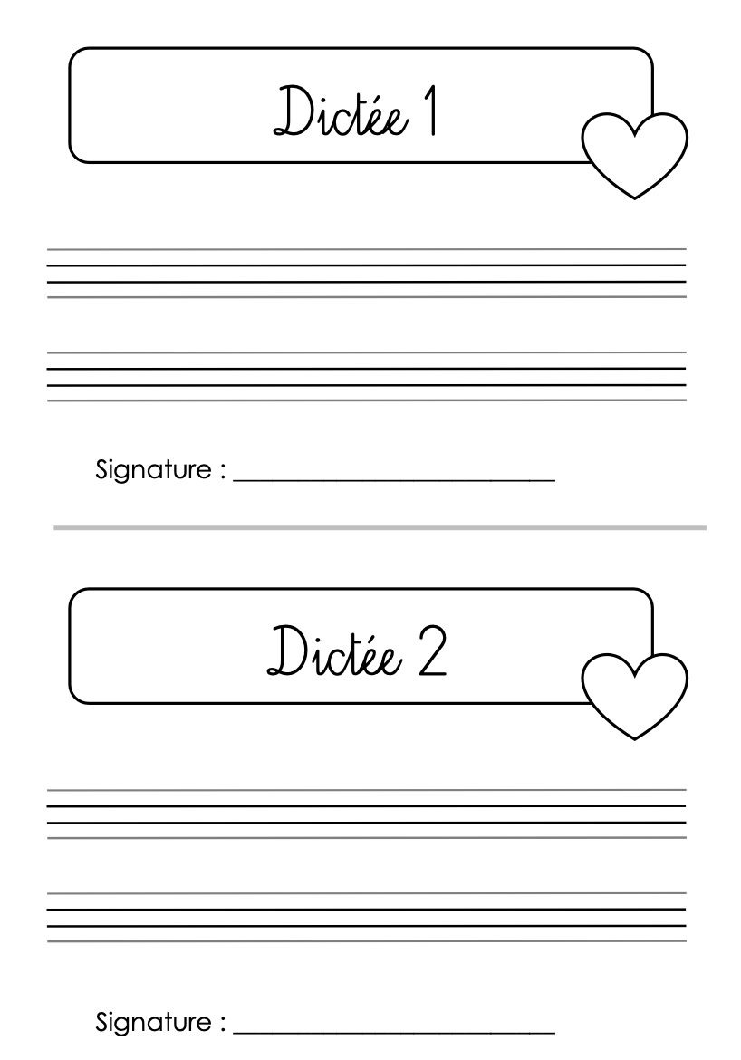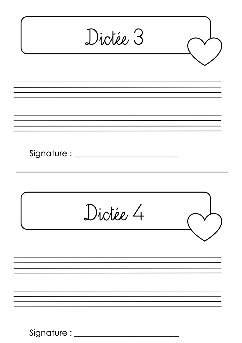 J'ai également réalisé un document word où toutes les dictées sont regroupées pour toute l'année scolaire avec un emplacement pour la note ainsi que les signatures des parents.