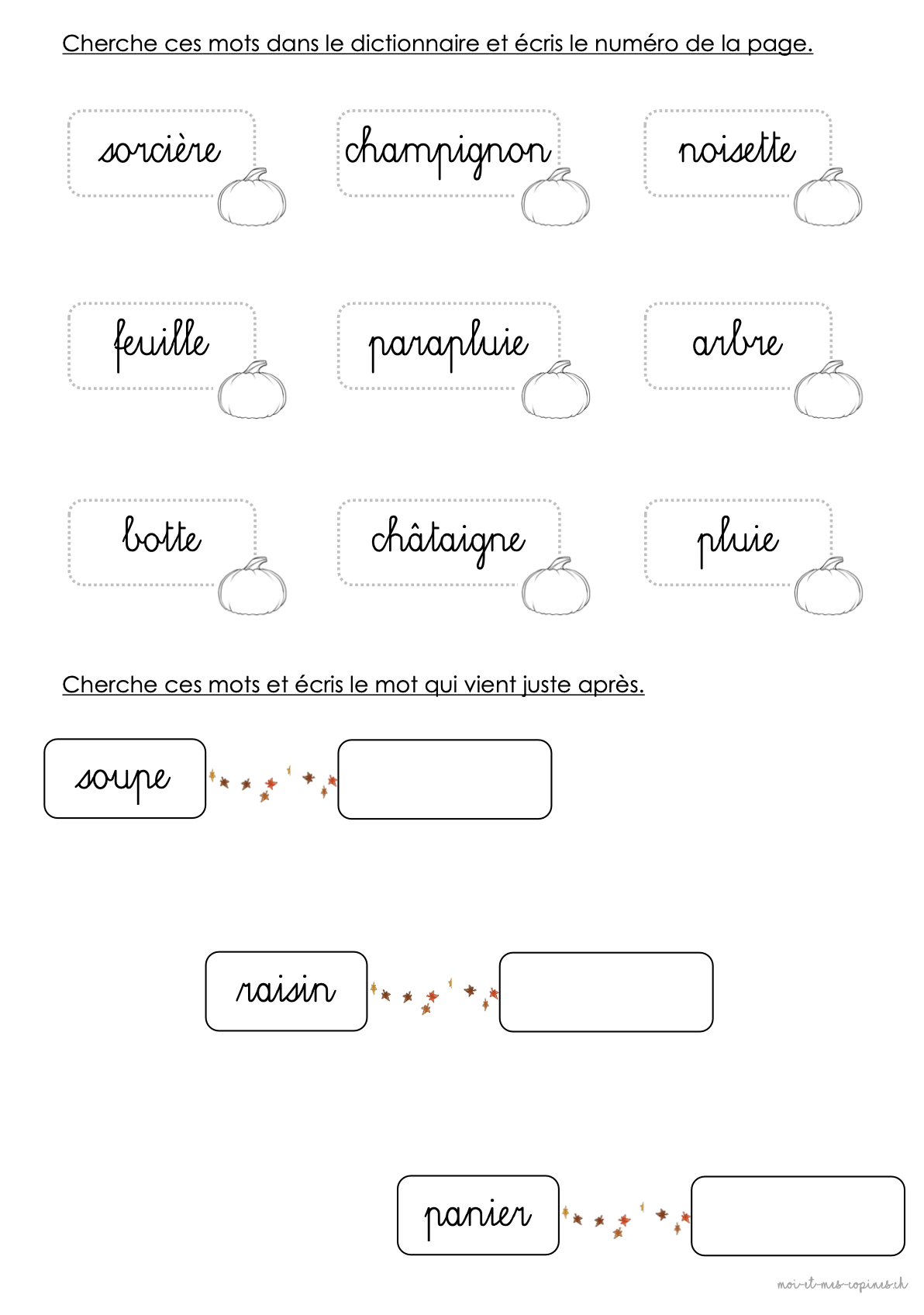🍂 Recherche de mots dans le dictionnaire avec l’imagier de l’automne modifié (je l’ai fait sous forme de défi, par équipe puis seul et avec un chronomètre)