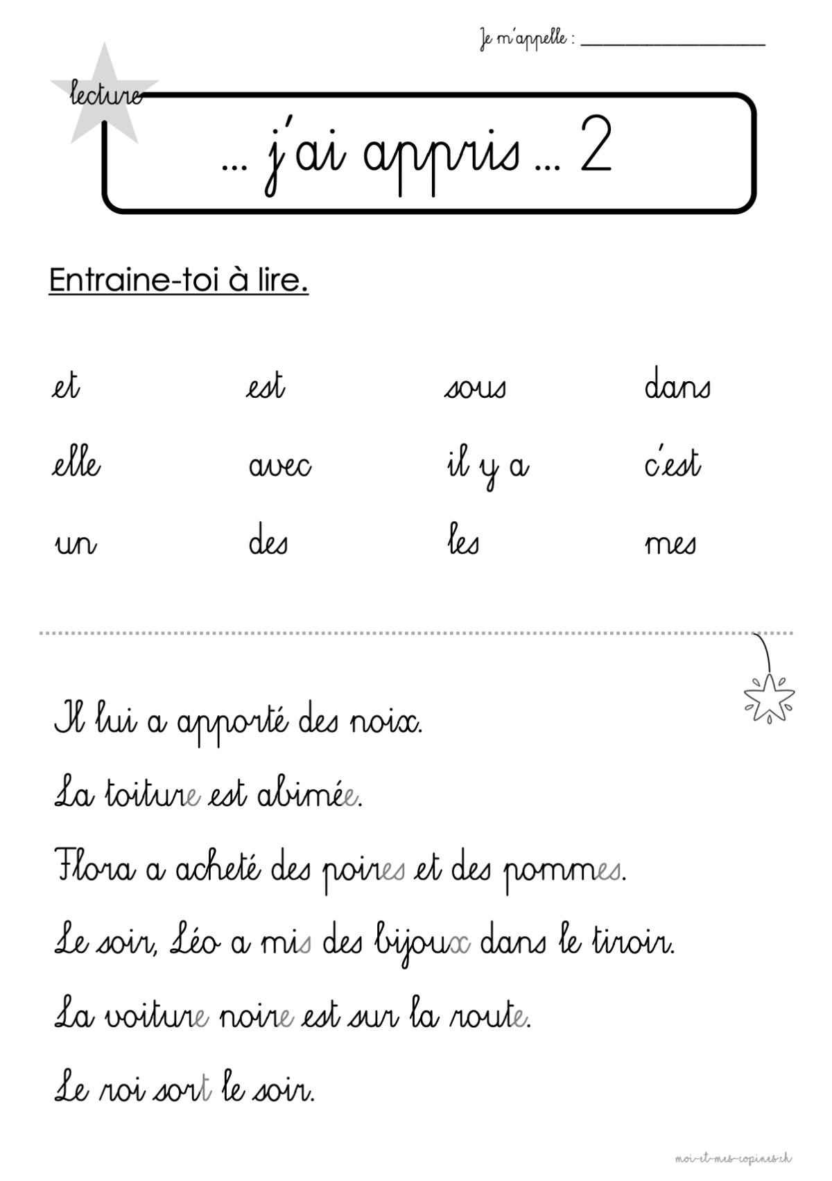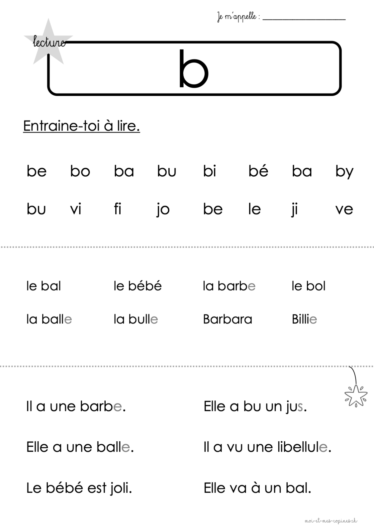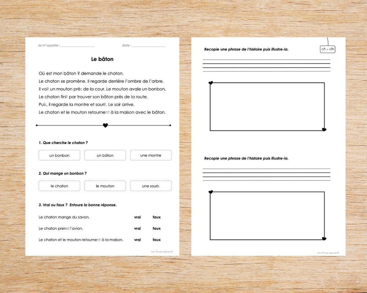 Les fiches travaillent les syllabes, les mots, les phrases puis des textes. Les lettres muettes sont grisées au début.