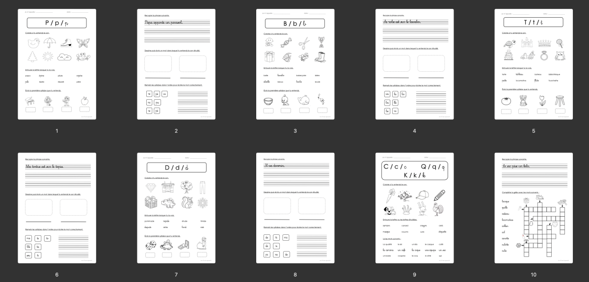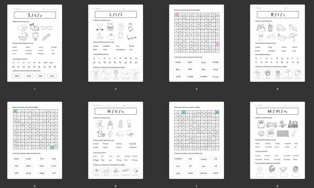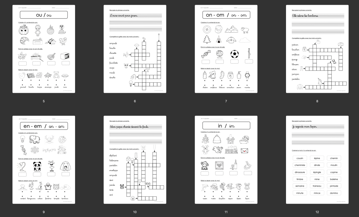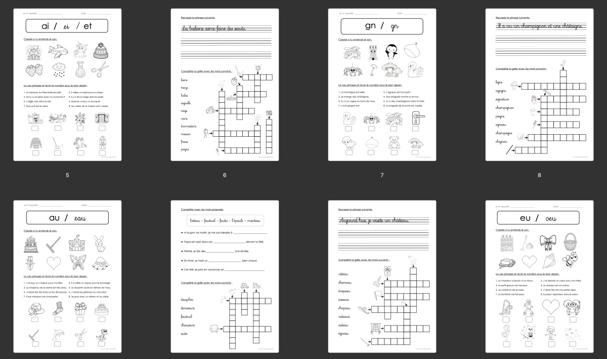 Pour chaque son étudié, j'ai réalisé une fiche d'exercices, une fiche d'écriture, une fiche de lecture et des jeux.
