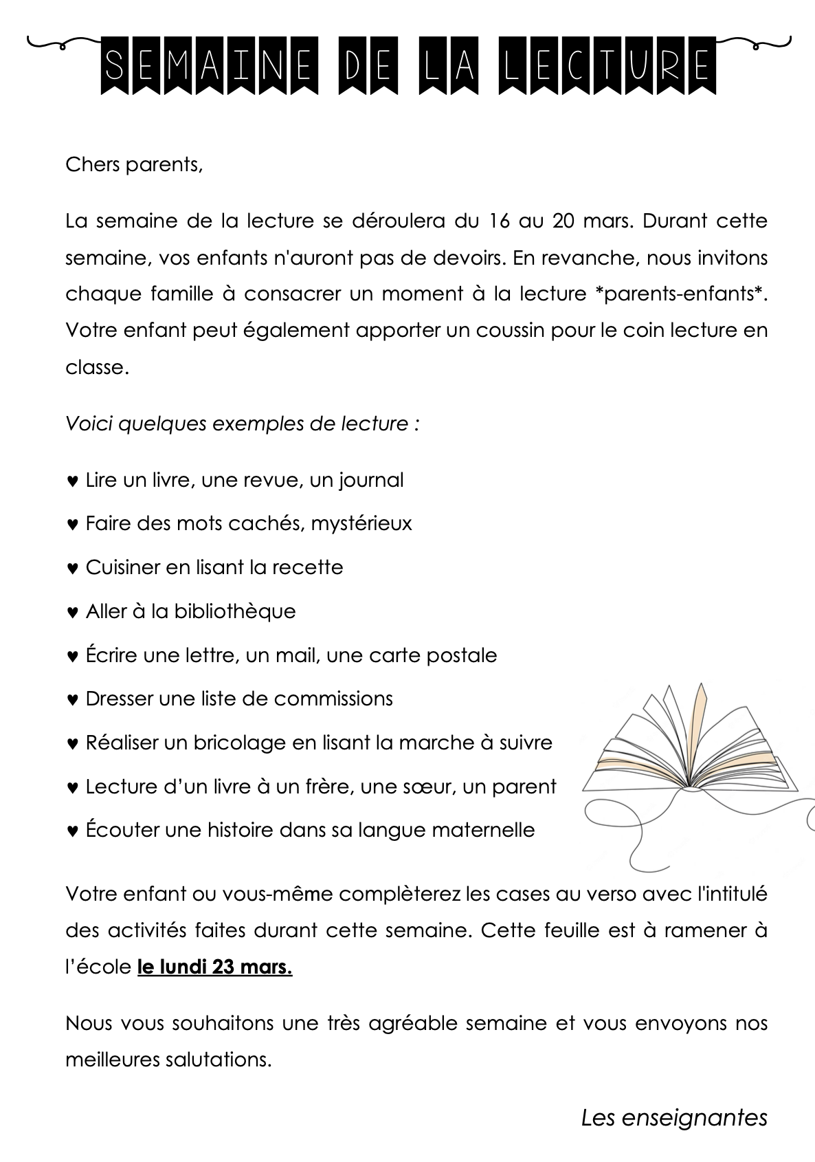 ❤ Les élèves n'ont pas de devoirs et nous proposons plusieurs moments *lecture parents-enfants*